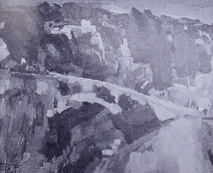 Paisaje con el acueducto para riego llamado el Gallopuente, sobre el río Mezquín, en Castelserás. La perspectiva y composición están copiadas del dibujo a lápiz, nº 108, añadiéndole en la parte izquierda una figura con un asno: La técnica pictórica recuerda el estilo de los pintores fauces, de manchas de color yuxtapuestas, pero sometidas a un esquema a modo de damero o planos regulares geométricos, al estilo Delaunay. Nº 9 del catálogo de la Exposición Homenaje de 1961. Museo Provincial. |