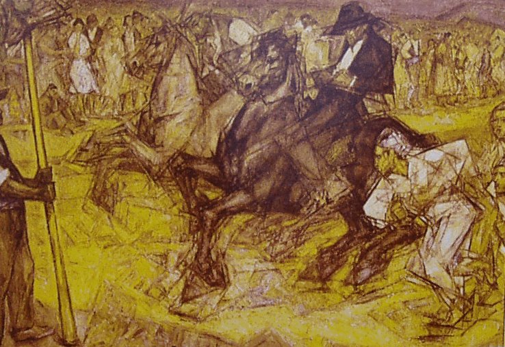 Óleo sobre lienzo, 100 x 144 cm. Firmado, signado y fechado e la parte inferior central: Fco. Marín y Bagües Leciñena 1913. Zaragoza 19-9-1953. Zaragoza, colección particular. Escena costumbrista que representa el final de una carrera pedestre, tal como era tradicional celebrarla a principios de siglo en los pueblos monegrinos. En el centro dos jinetes a caballo acompañando a tres corredores en el momento en el que el primero de ellos va a alcanzar la meta, situada en la parte izquierda, consistente en una horca o bieldo con pollos atados. Sostenida por un hombre. Como fondo, un friso de espectadores asisten a la escena. Marín Bagües ha centrado y resuelto felizmente todo el interés plástico en la representación del movimiento de corredores y caballos. Lo anecdótico quedaba muy lejos, acaso, en su primer boceto que cuidadosamente anota en 1913, donde aparece ya constituido el grupo central de jinetes y corredor. Nº 31 del Catálogo de la Exposición Homenaje de 1961 (Sala del Palacio Provincial) |