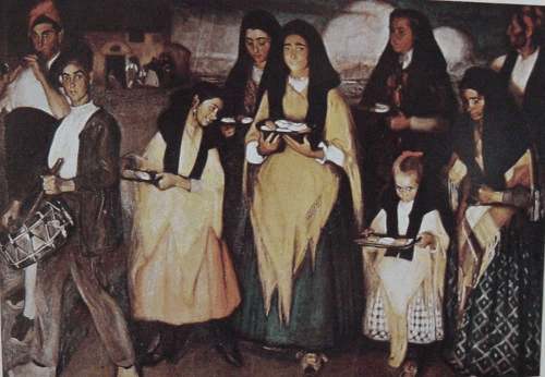 El cuadro fue adquirido por el Centro Mercantil de Zaragoza el 17 de enero de 1919, por 4.000 pesetas. A finales de la década de 1960 fue restaurado por la pintora Mª Pilar Burgues. Marín Bagües explotará exhaustivamente este tema aprovechando diversas figuras del cuadro, aisladas o en grupo, para nuevos cuadros como, por ejemplo, uno fechado en 1914, formado por la niña con la bandeja conducida por la mujer, alterando las facciones de la primera (Barcelona, colección particular, o la pareja de músicos con la que compondrá el cartel de las fiestas del Pilar de Zaragoza en 1916. En 1947 hará una interpretación parcial del tema. |