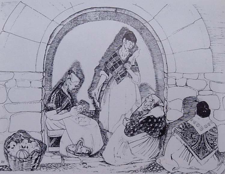Escena costumbrista ante un portal con tres mujeres sentadas y una de pie haciendo diversas labores y conversando; en el ángulo inferior izquierdo, una canasta con frutas. El título “aguaitando” corresponde a una expresión popular en Castelserás y en el Bajo Aragón que significa en su modo de infinitivo: criticar, alcahuetear, aplicada especialmente a las reuniones de mujeres. En 1943 realizará una versión al óleo, añadiendo en la parte inferior derecha un niño completando la naturaleza muerta de la izquierda con un jarro. Igualmente, reaprovechará algunas de las figuras para otras obras, como la de la vieja sentada en la silla que vuelve a aparecer en la misma actitud en el dibujo titulado “Guiñote”, o la otra anciana, que apoya la barbilla en la mano, figurará en postura inversa en el dibujo de esa misma serie, Jota y el gran cuadro de 1932. |