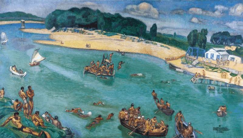 Óleo sobre lienzo, 102 x 191 cm Firmado, signado y fechado en el ángulo inferior derecho: Franco Marín y Bagües. Zaragoza. Agosto 1934-38 EL EBRO Zaragoza Museo Provincial de Bellas Artes. Amplia panorámica del río y de su orilla izquierda con una arboleda como fondo. Escenas de bañistas junto a la casa de baños, sobre los pontones con trampolines y barcas; en primer plano, a la izquierda, bañistas tomando el sol sobre las rocas de la orilla derecha. Marín Bagües, durante los cuatro años de elaboración del cuadro, tomó numerosas notas y apuntes del natural de estas escenas veraniegas desde el puente del ferrocarril. De ahí que emplee esa visión en picado que, por otra parte, deforma intencionadamente para buscar otros efectos plásticos eminentemente decorativos. En su lista de obras lo tituló el pintor como “Los Placeres del Ebro”. Nº 16 del Catálogo de la Exposición Homenaje de 1961. Museo Provincial |