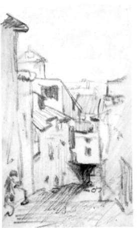 Calle en pendiente, con un paso cubierto al fondo. A la izquierda, en primer plano, la silueta de una mujer sentada. Estos 4 dibujos (45, 46, 47 y 48), los más logrados artísticamente de la serie, se caracterizan por un idéntico tratamiento de la composición, de carácter monumental, buscando las profundas perspectivas y el tratamiento de los edificios con un carácter netamente expresionista. A ello contribuye también el que la figura humana se halla reducida a un simple punto de perspectiva. |